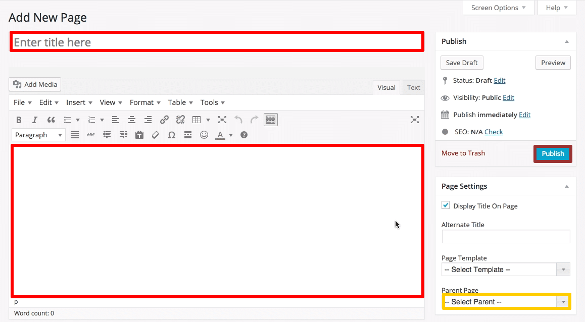 Note: Sometimes, pages are a sub-category of a main page (also known as a parent item). If the new is a sub-category, you'll need to let WordPress know the main page/parent page it belongs to.